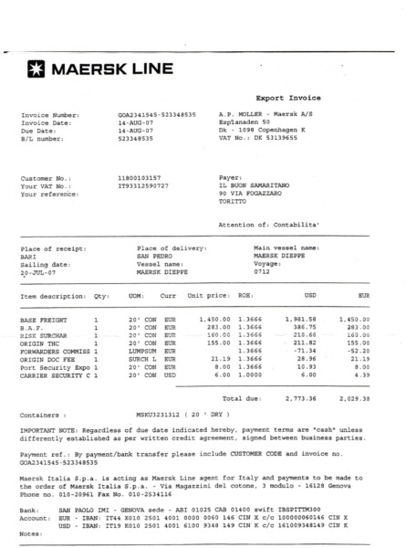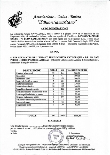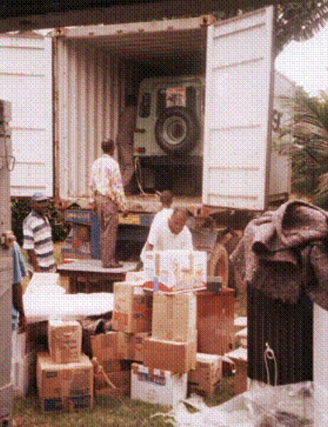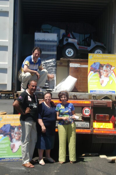 | Per la prima volta nonostante le difficoltà, i costi e la fatica che richiede tale impegno, siamo riusciti ad inviare un container dal porto di Bari per l’Africa. Impresa non facile ma ringraziando il Signore l’opera è andata felicemente a buon fine per la gioia nostra e di tanti che vivono in povertà. Il grande container conteneva un’autovettura fuoristrada Land Rover (9 posti) donata da un generoso sostenitore alla nostra Associazione, nonché biciclette, frigorifero, macchine da cucire, gruppo elettrogeno per la fornitura di energia elettrica, scrivanie, armadietti, lettino poliambulatorio, indumenti, alimenti, giocattoli, prodotti sanitari e casalinghi vari, etc. |