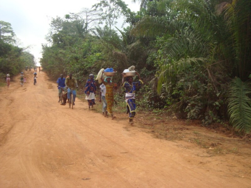 Ogni giorno, raggiungevo i villaggi, a bordo di un fuoristrada, accompagnato da una guida e da una consorella, percorrendo spesso sentieri di terra battuta di colore rosso, pieni di buche ed ostacoli, immersi nell’intensa foresta, circondata da altissimi alberi di palme, di caucciù, di cacao. Durante il tragitto, ogni sforzo e dolore fisico veniva superato perché i miei occhi vedevano bambini che, per raggiungere il loro villaggio, percorrevano tanti chilometri a piedi con le loro ciabattine o scalzi e donne che, in modo naturale, camminavano caricandosi sulla testa un recipiente di acqua, un cesto di banane, un fascio di legna e sulla schiena sostenevano i loro figli fasciati con dei teli coloratissimi.